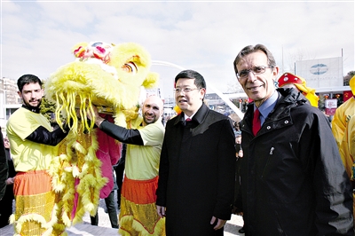 2月11日,在希腊塞萨洛尼基,中国驻希腊大使邹肖力(右二)、希腊塞萨洛尼基国际贸易博览会董事长齐卡斯(右一)与希腊舞狮队合影。 希腊塞萨洛尼基国际贸易博览会主办方11日举行隆重仪式庆祝中国元宵佳节,同时拉开了中国担任2017年博览会主宾国的序幕。 新华社记者 刘咏秋 摄