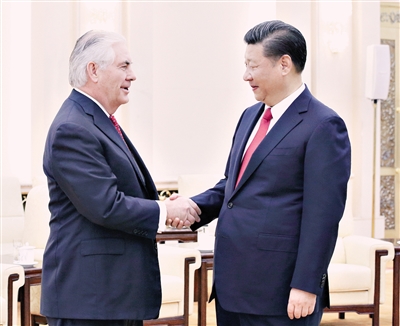 3月19日,国家主席习近平在北京人民大会堂会见美国国务卿蒂勒森。习近平指出,当前,中美关系发展面临重要机遇。我同特朗普总统通过通话和通信保持着良好沟通。我们都认为,中美两国完全可以成为很好的合作伙伴。只要双方坚持这个最大公约数,中美关系发展就有正确方向。希望双方按照我同特朗普总统达成的共识和精神,加强高层及各级别交往,拓展双边、地区、全球层