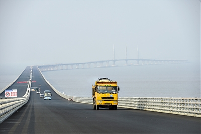 图为一辆运输沥青的工程车辆行驶在港珠澳大桥桥面上(4月29日摄) 新华社记