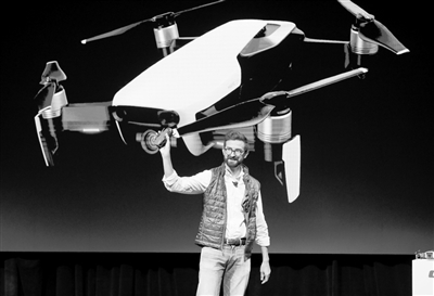 图为当日,在美国纽约,大疆公司战略合作总监迈克·佩里在发布会上介绍新款无人机Mavic Air。新华社记者 王迎 摄