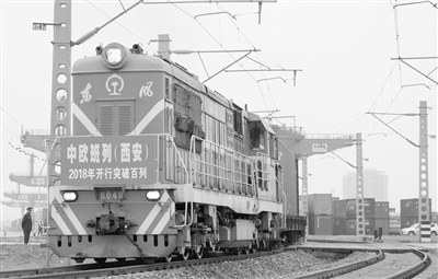 3月7日,开往德国汉堡的X8001次中欧班列从西安新筑车站驶出。 当日,装载有45车集装箱的X8001次中欧班列从中国铁路西安局集团有限公司新筑车站驶出,满载着中国制造的汽车配件、食品原料、家具电器、日用百货等产品开往德国汉堡,这标志着2018年陕西中欧班列开行突破100列大关。 新华社记者 李一博 摄