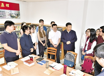 5月2日,中共中央总书记、国家主席、中央军委主席习近平来到北京大学考察。这是习近平在北京大学马克思主义学院,与正在就“解读新时代”进行座谈交流的中外学生亲切交谈。 新华社记者 李涛 摄
