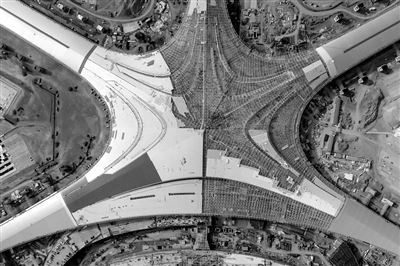 青岛胶东国际机场一期呈海星状,突出了青岛的海洋文化。图为7日无人机航拍的青岛