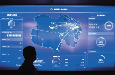 图为当日,在国家电网青海新能源大数据科技公司筹备组办公室内,工作人员从监控大屏前经过。新华社