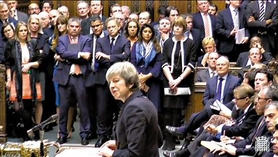 12月10日,在英国伦敦,英国首相特雷莎·梅(前)在英国议会下院发表讲话。 英国首相特雷莎·梅10日说,她将推迟在议会下院就“脱欧”协议进行表决,并将在未来几日继续与欧盟方面就协议内容进行谈判。英国议会下院原定于11日举行投票,对英国政府与欧盟此前达成的“脱欧”协议进行表决。(相关报道见三版) 新华社/美联