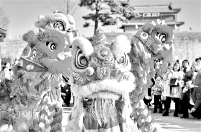 1月28日,游客在河北秦皇岛山海关古城观看舞狮表演。 当日是农历腊月二十三,我国北方的“小年”,人们以各种形式营造喜庆祥和的节日气氛。 新华社发(郭楠 摄)