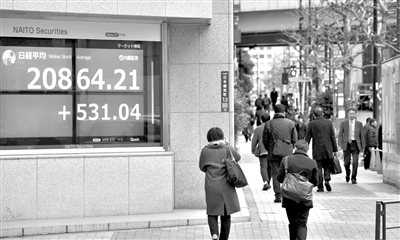 2月12日,在日本东京,行人经过股市信息显示屏。