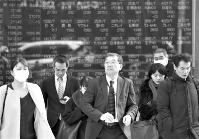 2月14日,在日本东京,路人在一块股市电子显示屏前行走。