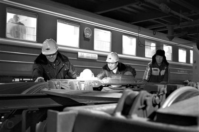 在寒夜中坚守岗位的换轮工,保证了国际旅客列车顺利通行。谈起工作时的艰辛,他们却不以为意。换轮工王晓宇说:“每个工作都有自己的辛苦。我们的工作环境已经比老一辈好多了,他们在换轮的时候没有机械牵引,换下的转向架要靠换轮工推出轨道,手套都能冻在转向架上。”