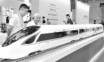 5月16日,观众在展会上参观“复兴号”动车组模型。 当日,第二届中国西部国际投资贸易洽谈会在重庆举行,共有95个国家和地区的4000余家企业(机构)参展。新华社记者 王全超 摄
