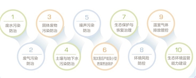 这“十大污染防治工程”包括:废水污染防治、固体废物污染防治、噪声污染防治、生态保护与恢复治理、废气污染防治、土壤与地下水污染防治、温室气体排放管控、生态环境监管能力建设、淘汰落后产能及小型燃煤燃油锅炉、环境风险防控。