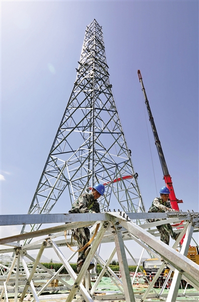 近日,张北至雄安1000千伏特高压交流输变电工程第一基铁塔开始组立,标志着该工程输电线路部分进入组塔阶段。张北至雄安1000千伏特高压交流输变电工程起于河北省张家口市张北特高压变电站,止于雄安特高压变电站,旨在开辟张家口可再生能源示范区新能源送出新通道,保障雄安新区清洁能源供应,助力京津冀协同发展。工程将于2020年7月底投入运行。 记者 杨世尧 摄
