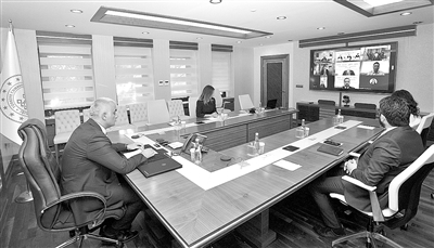 7月28日,土耳其文化和旅游部长穆罕默德·埃尔索伊(左一)在安卡拉出席微信支付业务线上签约活动。 中国工商银行(土耳其)股份有限公司(工银土耳其)、腾讯、伊斯坦布尔新机场运营公司和新机场免税店28日联合举办微信支付业务线上签约活动。自此,中国游客可在伊斯坦布尔新机场免税店使用微信支付。 新华社发