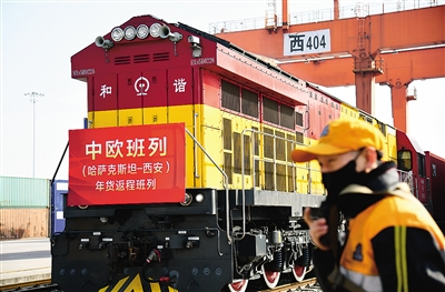 2月3日,满载年货的中欧班列抵达中国铁路西安局集团有限公司新筑车站。 当日,满载着49车“洋年货”的X9020次中欧班列抵达中国铁路西安局集团有限公司新筑车站,这是2021年从哈萨克斯坦开出后抵达西安的首趟中欧班列(西安)年货返程班列。这趟班列装载有面粉、食用油、蜂蜜、糖果等丰富的年货产品。 新华社记者 李一博 摄