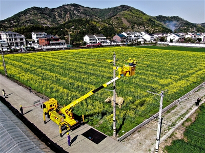 3月22日,慈溪市电力部门对匡堰镇“匡堰花海”景点的线路进行扩容改造,满足乡村旅游的需求(无人机照片)。
