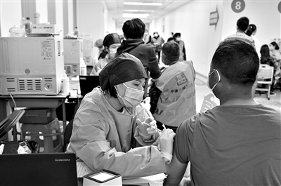 4月6日,在上海市奉贤区的新冠疫苗临时集中接种点,医务人员为工人接种新冠疫苗。 当日,中建三局三公司华东分公司上海某项目部组织105名建设工人前往上海市奉贤区的新冠疫苗临时集中接种点参加接种。据悉,考虑到工人作业时间,上海市奉贤区金海街道协调西渡接种点,为辖区内的3000多名建设工人开设了夜间接种通道,方便工人接种新冠疫苗。 新华社记者 丁汀 摄