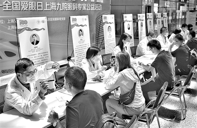 6月6日,医务人员在上海虹桥火车站候车大厅为旅客检查眼睛。 当日是第26个全国爱眼日。上海交通大学医学院附属第九人民医院眼科党支部与上海虹桥火车站党总支在上海虹桥火车站联合开展科普宣讲及义诊活动,眼科医疗专家现场为旅客提供义诊、眼部检查和眼健康科学知识宣讲等服务。 新华社记者 陈飞 摄
