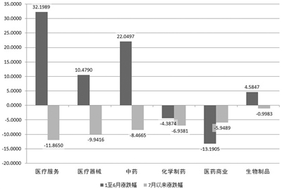 从板块整体走势看,上半年医疗服务板块在医药行业六个子行业中涨幅居首,7月以来震荡回调,且在六个医药子板块中跌幅最大。同花顺数据显示,7月1日至8月10日,申万医疗服务行业指数下跌11.86%,板块内八成个股走低,国际医学、光正眼科、盈康生命期间跌幅均超过20%。