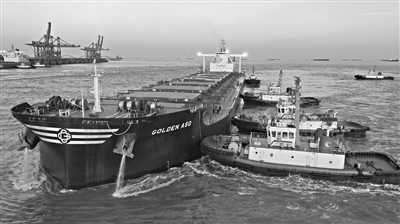 10月20日,一艘轮船在拖轮的协助下向唐山港曹妃甸港区矿石码头靠泊(无人机照片)。 记者从河北省唐山市海洋口岸和港航管理局获悉,今年1至9月份,唐山港曹妃甸港区吞吐量达32652万吨,同比增长11.34%。 新华社记者 朱旭东 摄