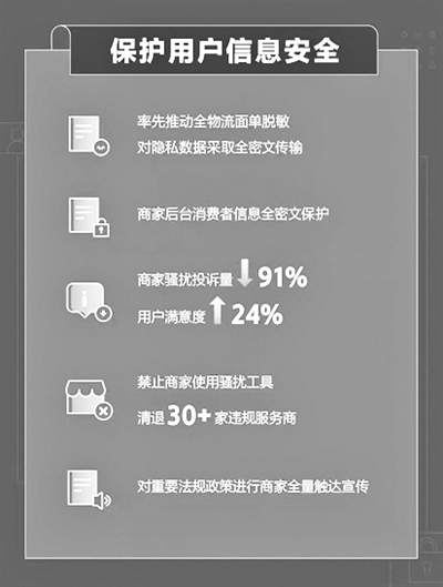 报告披露,平台对商家和服务商使用消费者数据行为进行严格管控。在遵循相关法律的前提下,对商家后台的消费者信息进行全密文安全保护,为保障发货过程中个人信息的安全,在行业内率先实行全物流面单脱敏,对订单信息进行全链路加密,对隐私数据采取全密文传输。截至2021年底,加密发货订单覆盖率达85%。