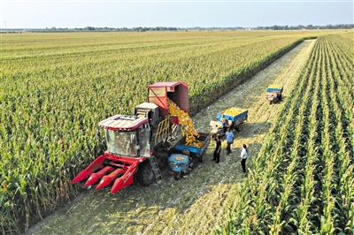 9月29日,在山东省乐陵市芦庵村,农户进行玉米机收作业(无人机照片)。 当日,山东德州乐陵市“吨半粮”核心区玉米开始收割,农户运用大马力收割机、翻耕机等现代化农机装备进行劳作,田间地头一派繁忙秋收景象。 新华社记者 范长国 摄