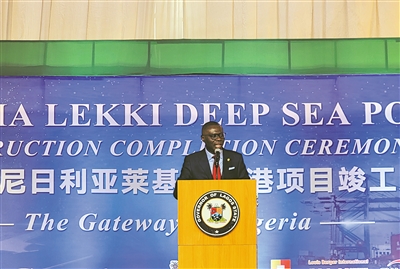 10月31日,在尼日利亚拉各斯,拉各斯州州长巴巴吉德·桑沃-奥卢在中企承建的尼日利亚莱基深水港竣工仪式上致辞。 10月31日,中国港湾工程有限责任公司承建的尼日利亚莱基深水港项目在尼经济中心拉各斯举行竣工仪式。 新华社记者 郭骏 摄