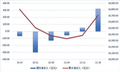 据Wind统计,截至11月18日收盘,11月以来的三个交易周中,北向资金分别净买入-50.11亿元、54.00亿元以及322.83亿元。其中,11月14日至18日当周,北向资金连续五个交易日均为净买入,周内净买入金额位列全年44个交易周中的第二位,仅次于今年6月10日所属交易周的368.30亿元。月度数据则显示,与10月净卖出573.00亿元相比,截至11月18日,北向资金11月净买入已达416.84亿元。