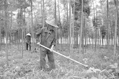夏日清晨,福建省建瓯市东峰镇长源村河畔,一片片青翠欲滴的雷竹随风摇曳,沙沙作响。趁着早晨天气凉爽,长源村雷竹种植大户谢乐锋带着几位村民在竹林里锄草、平整土地、施肥,忙得热火朝天。