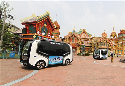 近日,无人驾驶乘用车和零售车驶进上海海昌海洋公园,提供短驳游览的便民服务。