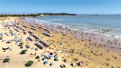 游客在浙江省舟山市朱家尖南沙景区游玩(无人机照片)。新华社发(邹训永 摄)