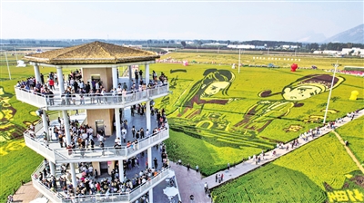 游客在河北省遵化市一景区观景台观赏稻田画(无人机照片)。新华社发(李磊 摄)