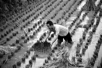 与我国其他一些省份稻谷丰收的场面不同,顾贤所在的贵州黔东南苗族侗族自治州台江县别有一番景象。“收割谷子时,我们不会把田里的水全部放完,这样能边收稻谷边捕鱼。”