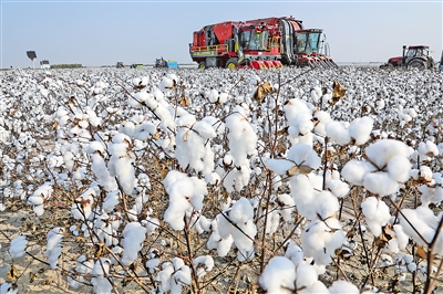 10月22日,棉农驾驶机械在无棣县西小王镇国家级棉花生产基地核心示范区内进行采棉作业。无棣县地处黄河三角洲棉区中心,可利用盐碱耕地资源丰富,植棉历史悠久,常年植棉面积稳定在10万亩左右。新华社记者 朱峥 摄