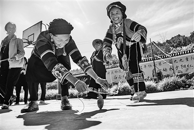 10月22日,云南省文山壮族苗族自治州马关县木厂镇杨茂松村村民在重阳节活动中打陀螺。重阳节来临之际,各地举行丰富多彩的活动,与老人们一起喜迎传统佳节。新华社发(查宇波 摄)