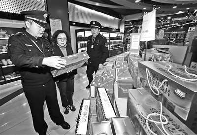 随着春节临近,浙江嘉兴的年货市场年味渐浓,嘉兴市南湖区市场监管局对全区核心商圈和重点场所开展年货市场专项检查,着力营造良好的节日消费环境。图为1月9日拍摄的嘉兴市南湖区市场监管局建设所执法人员在江南超市内检查食品。新华社记者 徐昱 摄