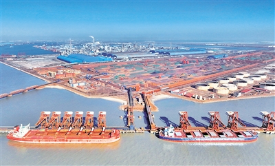 记者从河北省交通运输厅获悉,2023年河北省港口货物吞吐量达13.6亿吨,创历史新高。图为两艘轮船靠泊在唐山港曹妃甸港区矿石码头卸载(无人机照片)。新华社记者 杨世尧 摄