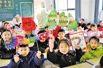 2月25日,河南省沁阳市李商隐小学学生在展示寒假手工作业,迎接新学期的到来。近日,全国多地学校学生返校报到,迎来春季开学。新华社发(杨帆 摄)