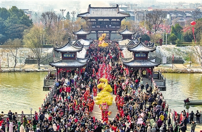 2月25日是农历正月十六,安徽省滁州市全椒县传统民俗活动“走太平”拉开帷幕,巡游队伍穿过太平桥,献上精彩纷呈的民俗表演。新华社发(刘玉才 摄)