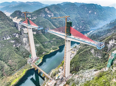 图为位于重庆市彭水县境内的渝湘复线高速磨寨乌江特大桥建设现场(3月17日摄)。近日,由中国铁建港航局集团承建的渝湘复线高速公路控制性工程——磨寨乌江特大桥已完成建设进度80%,进入全桥合龙前的冲刺阶段。新华社记者 唐奕 摄