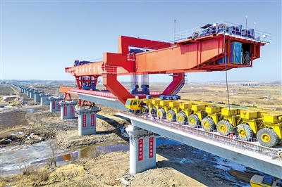 3月25日,在位于黑龙江省绥化市庆安县的哈伊高铁哈尔滨至铁力段施工现场,历时近1小时的架梁作业后,长32米、重约750吨的箱梁稳稳架设在安邦河特大桥桥墩上,标志着哈伊高铁哈铁段建设进入架梁施工阶段。哈伊高铁起自哈尔滨市,途经绥化市,终至伊春市,正线全长318公里,设计时速250公里。图为中国铁建大桥工程局集团有限公司的工作人员在进行架梁作业。新华社记者 张涛 摄