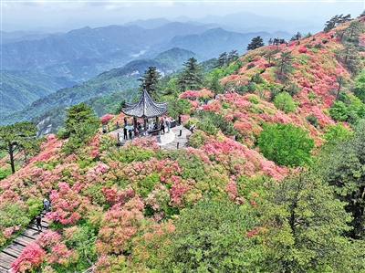 4月29日,游客在龟峰山景区杜鹃花海游玩(无人机照片)。此景区的天然古杜鹃群落平均树龄在百年以上,每年春季,集中连片的杜鹃花绽放,形成红色花海,美不胜收。