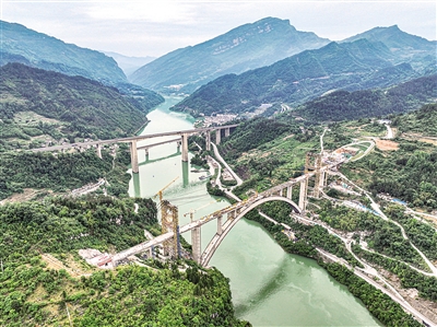 这是5月6日拍摄的建设中的渝湘高铁黄草乌江双线大桥(无人机照片)。近日,由中铁大桥局承建的渝湘高铁重庆至黔江段黄草乌江双线大桥顺利实现合龙,进入桥面系及附属工程施工阶段。随着黄草乌江双线大桥的合龙,由中铁大桥局承建的渝湘高铁重庆至黔江段三座横跨乌江的铁路桥,已全部完成主体结构施工。新华社记者 唐奕 摄