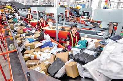 6月18日,在浙江省湖州市长兴县星网电子商务创业园一家快递企业,工作人员忙着分拣、扫描出库等工作。时值电商平台“618”年中促销活动高峰,各地电商、物流等线上线下企业、商家全力应对。新华社发(谭云俸 摄)
