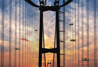 2022年5月15日,深中大桥完成首根主缆索股架设,这是我国自主研发的2060兆帕钢丝首次大规模应用于桥梁建造。