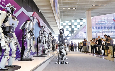 图为一组人形机器人在展览入口处进行集中展示。新华社记者 方喆 摄
