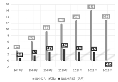 同花顺iFinD数据显示,2017年至2020年,普利制药营收从3.25亿元逐年增长至11.89亿元,扣非净利润由0.87亿元持续增长至3.80亿元。不过,其业绩稳定增长的态势自2021年起开始变化。2021年至2023年,普利制药营收分别为12.99亿元、16.19亿元、13.04亿元,扣非净利润依次为2.93亿元、2.72亿元、-0.13亿元。公司扣非净利润自2021年起持续走低,并在2023年出现了上市以来首次亏损。公司营收也在2023年迎来了上市以来首次下滑。