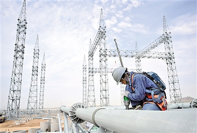 7月10日,国网宁夏电力公司工作人员在“宁电入湘”中宁换流站施工。据了解,“宁电入湘”特高压线路工程是我国首个沙漠、戈壁、荒漠地区风电光伏基地外送电的特高压工程,途经宁夏、甘肃、陕西、重庆、湖北、湖南等地,线路全长1634公里。该工程计划于2025年建成投运,投运后年输送电量将达360亿至400亿千瓦时。新华社记者 王鹏 摄