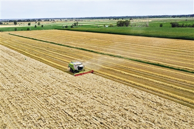 在新疆昌吉回族自治州奇台县西北湾镇,农户在田间收获小麦。目前,新疆已收获小麦超过1000万亩,小麦单产和品质继续好于上年,天山南北丰收可期。 新华社记者 丁磊 摄