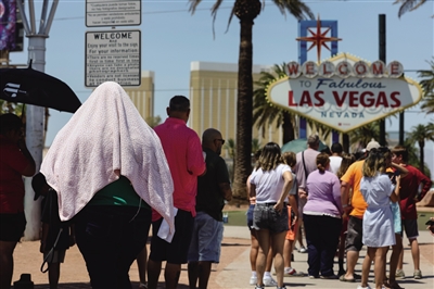 近期,美国多地遭受热浪袭击,不少地区近几日频频刷新当日最高气温纪录。图为美国内华达州拉斯维加斯一名女子在街头披上毯子遮阳。新华社/美联