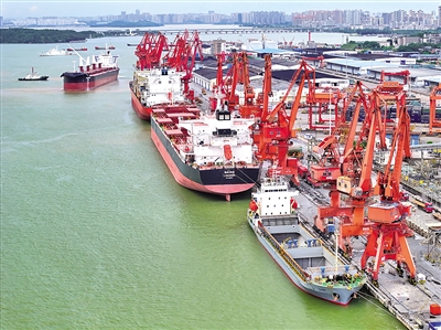 7月21日,船舶在广西北部湾港防城港港区码头装卸货物(无人机照片)。今年以来,广西北部湾港货物吞吐量呈现明显的增长势头,码头一派繁忙景象。据北部湾港股份有限公司最新公布的消息显示,2024年上半年累计完成货物吞吐量15724.66万吨,同比增长5.46%。新华社记者 周华 摄